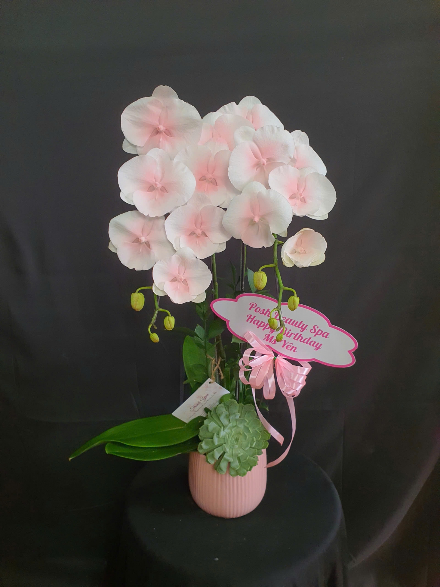 Mỗi nghệ nhân cắm hoa sẽ tạo ra các mẫu hoa khác nhau, không hoàn toàn giống nhau 100% và có độ tùy biến đôi chút, hoalantacpham.com cam kết đảm bảo tầm 90%-95% như mẫu cho quý khách hàng (100% sản phẩm hoa lan từ người dân làng hoa Lâm Đồng)